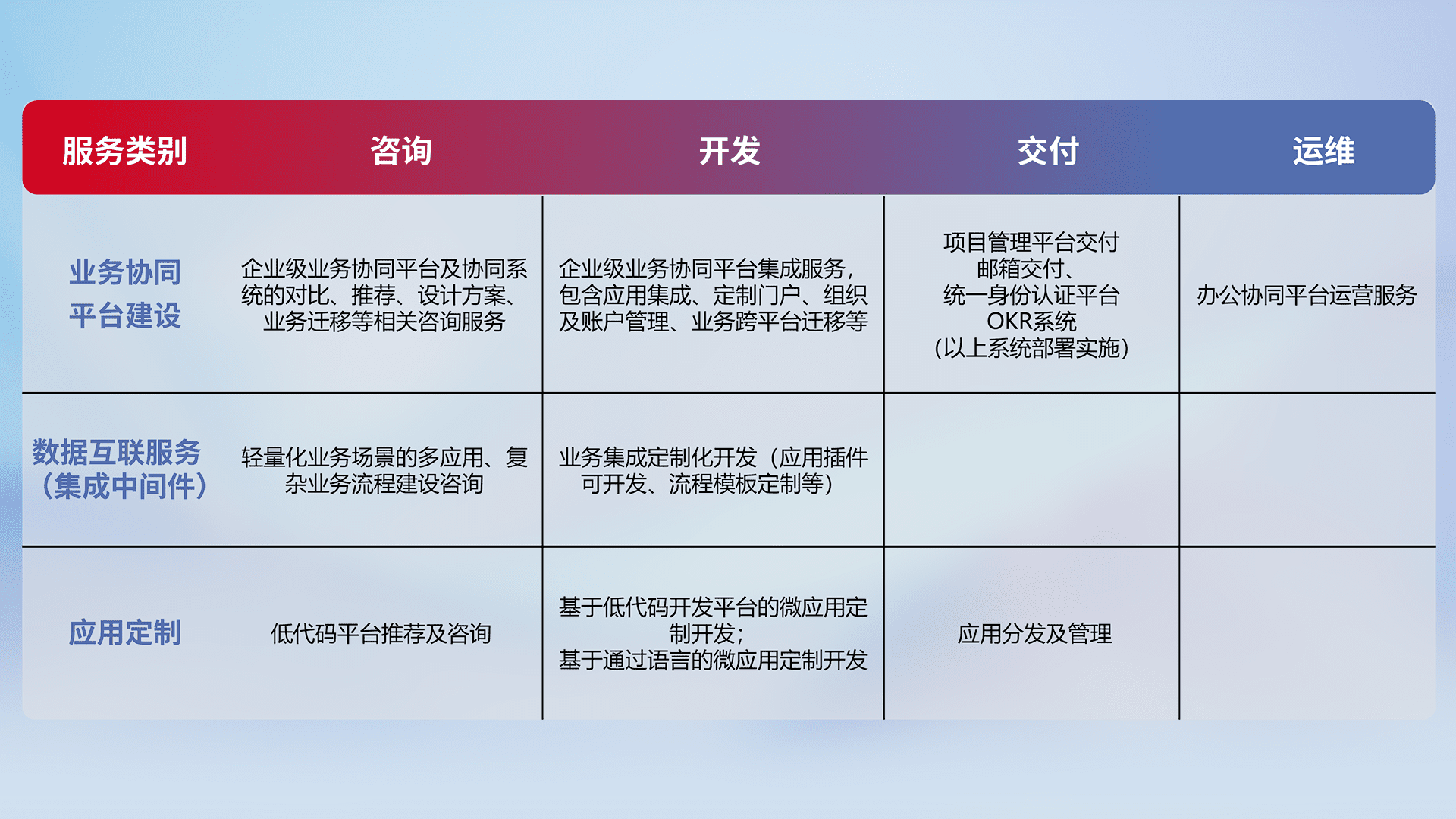 针对钉钉、、、、企微、、、IDaas等平台级产品提供产品的规划、、、、方案、、、、交付、、、定制化开发等服务,,,,实现如统一协同办公、、、智能客户服务、、混合会议管理、、、、智能数据查询、、等业务场景,,,实现数字化转型。。。。